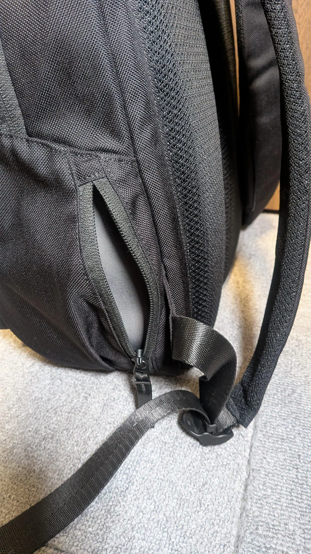 右のサイドポケットは背負ったままでも前に抱えたままでも使いやすく、パスケースなどをスムーズに取り出せます。